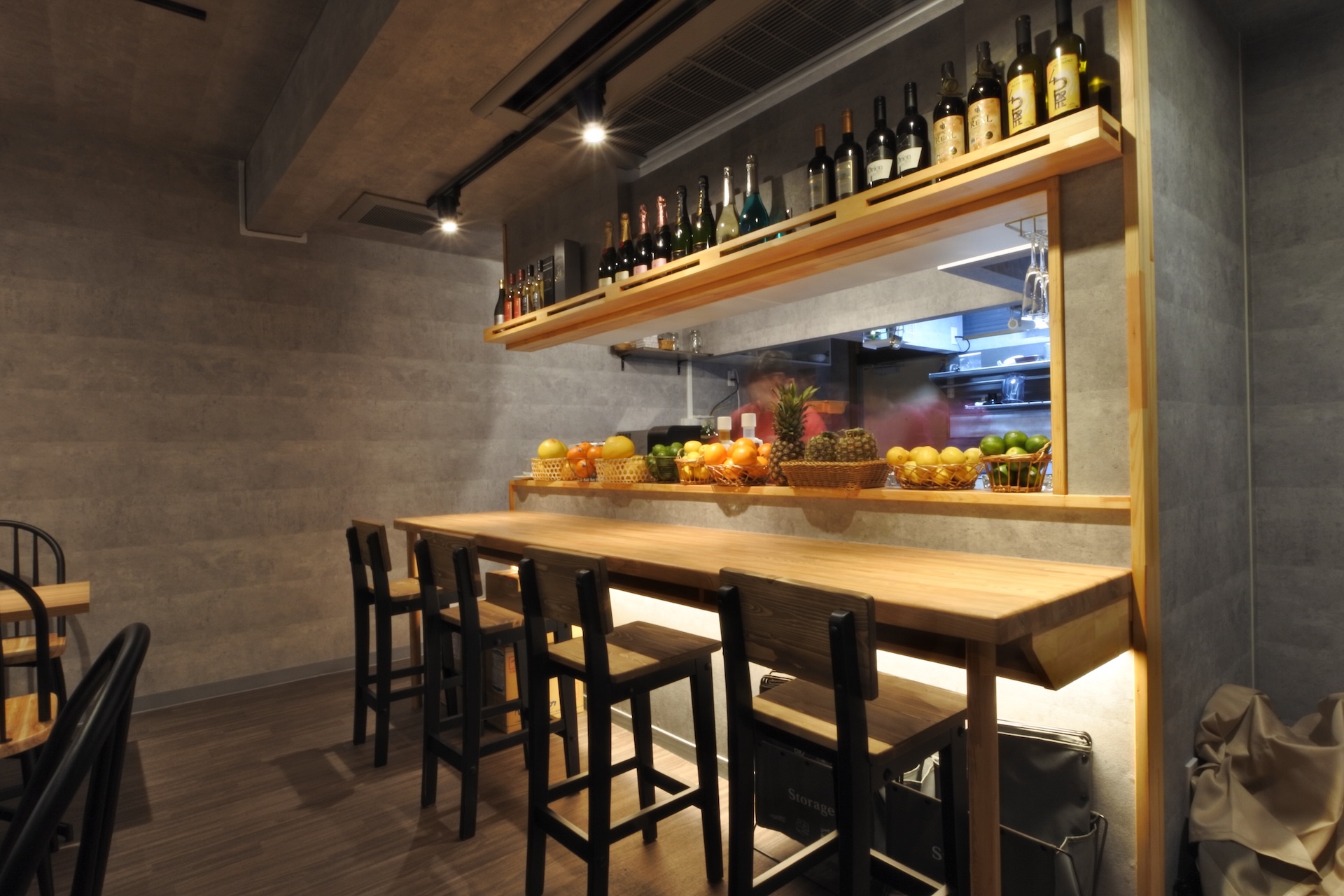 以前は居酒屋だった空きテナントを、木の温もりとコンクリート調の壁が調和した落ち着いたバーに改修。無垢材のカウンターにはフルーツが美しく映え、香りと彩りを楽しめる空間に。お客様との会話も弾み、リピーター様も増加中です!